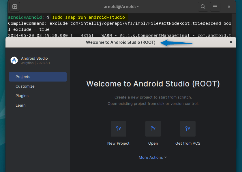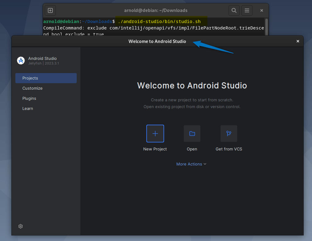 Now to launch Android Studio on Debian 12 installed via Snap package installer execute: