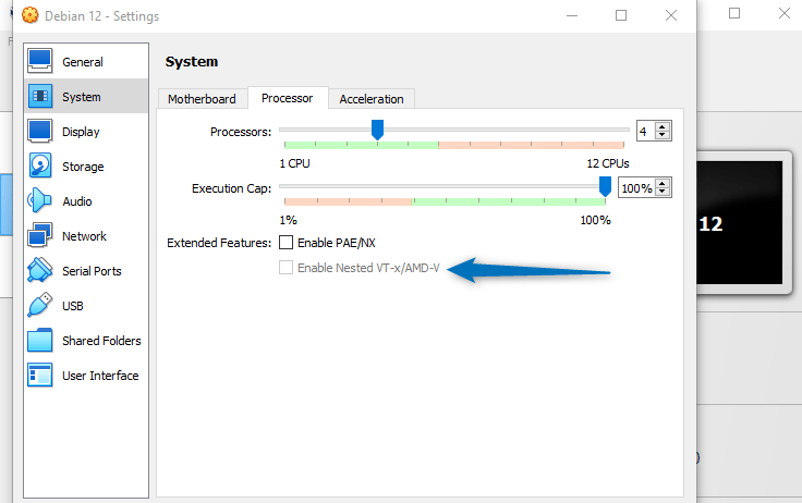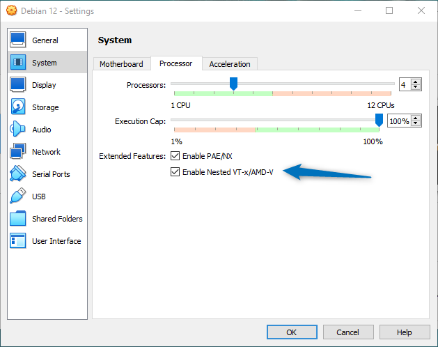 Next, verify the changes by navigating to the processor settings under the system option of VirtualBox: