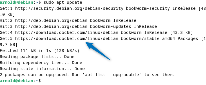 Now add the Docker repository in the Debian 12 sources list file and sign it using the GPG key added in the first step: