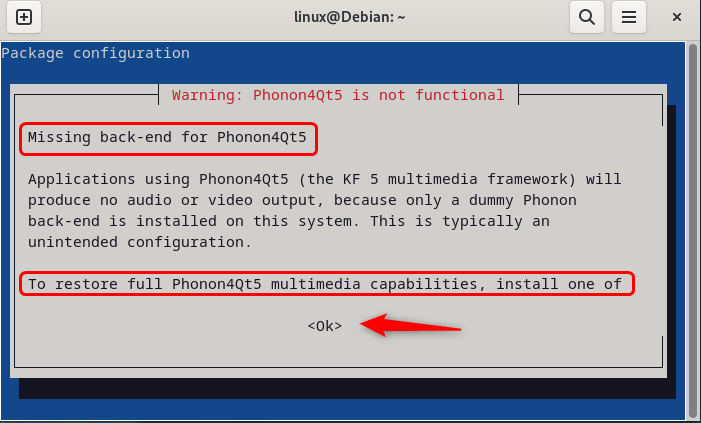 Now the KDE installer will open and ask about installing Phonon4Qt5 which is a version of the Phonon 4 library specifically built against Qt5. Phonon is a multimedia framework used by KDE applications for handling audio and video playback, so click OK to allow its installation: