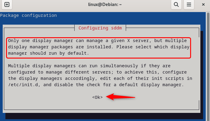 Next, the installer asks about selecting the display manager as only one display manager can be used at a time: