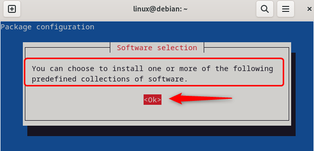 Now select the KDE plasma desktop by pressing the space bar from the keyboard and click on ok to proceed further: